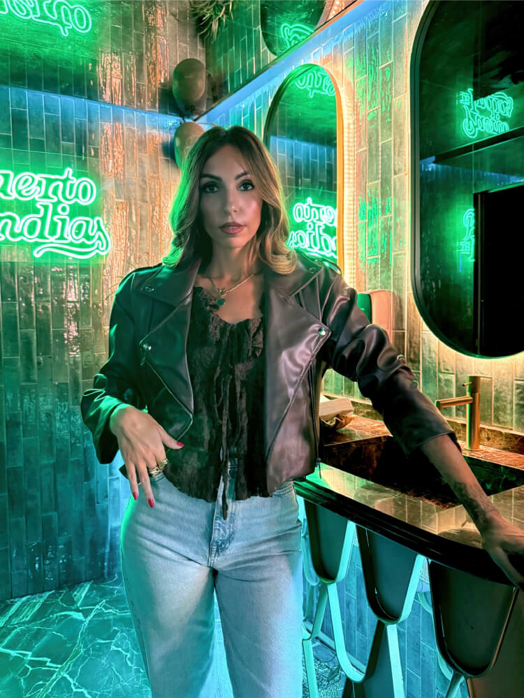 Biker en polipiel con corte estructurado, el acabado mate y los detalles metálicos plateados le dan un aire urbano y sofisticado. Cierre frontal con cremallera que aporta funcionalidad y estilo.