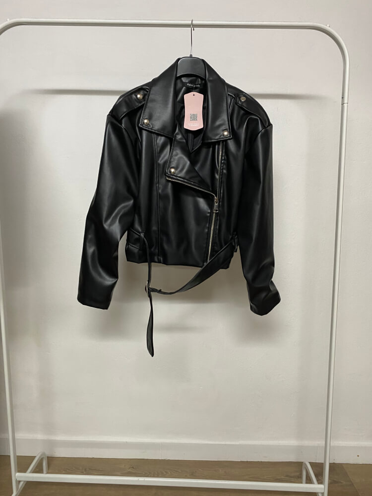 Biker en polipiel con cierre frontal de cremallera y detalles metálicos plateados. Corte estructurado y acabado mate. Atemporal, versátil y con carácter.