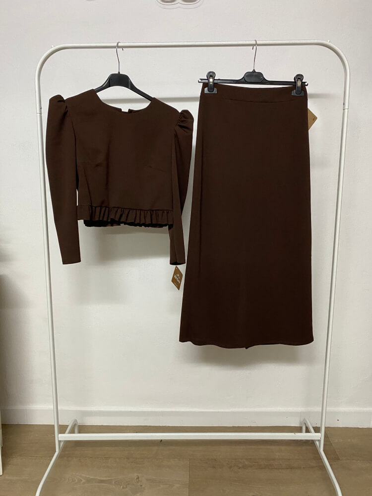 Conjunto de top y falda en tejido crespón elástico. El top se puede poner con los botones hacia delante o detrás.