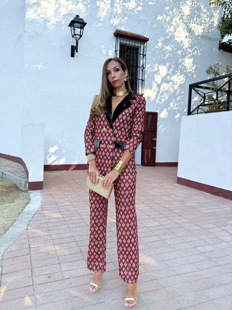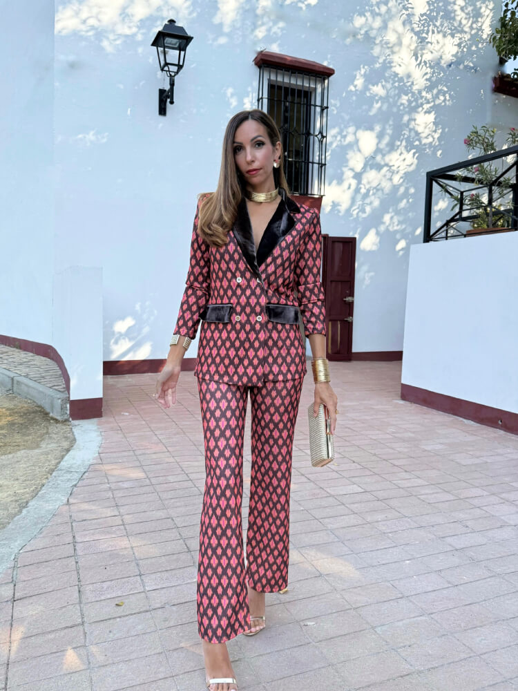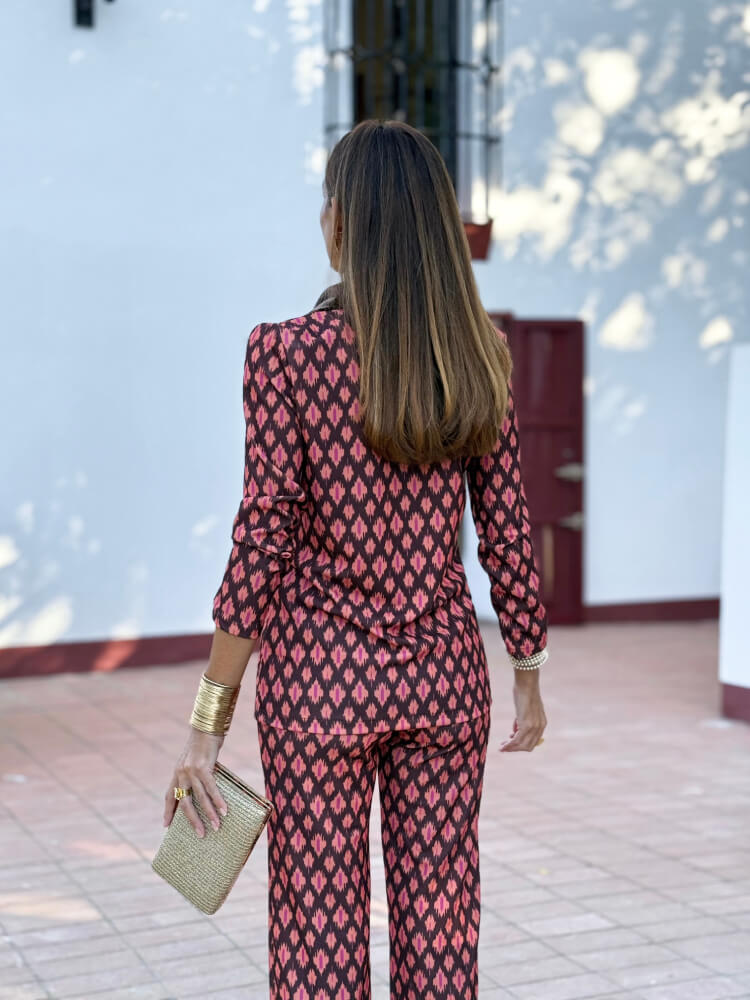 Conjunto de dos piezas con estampado geométrico en tonos cálidos. La blazer lleva hombreras, se abotona al frente y está combinada con terciopelo marrón en solapas y bolsillos. El pantalón, sin botones ni cremallera, se ajusta con goma elástica en la cintura. Una propuesta cómoda y llamativa para invitadas que buscan estilo con carácter.