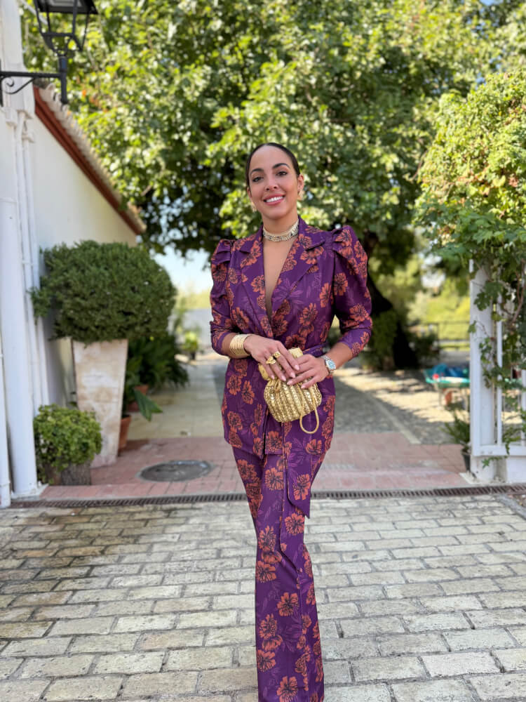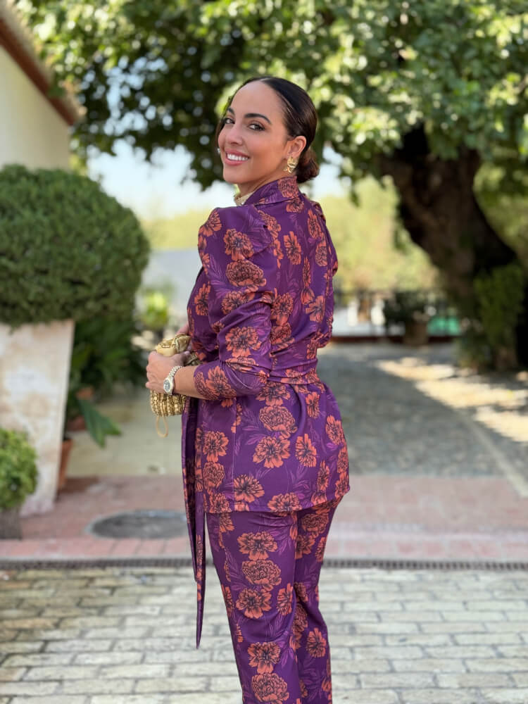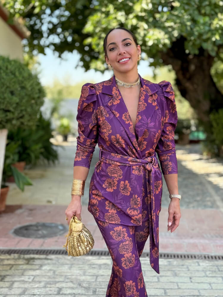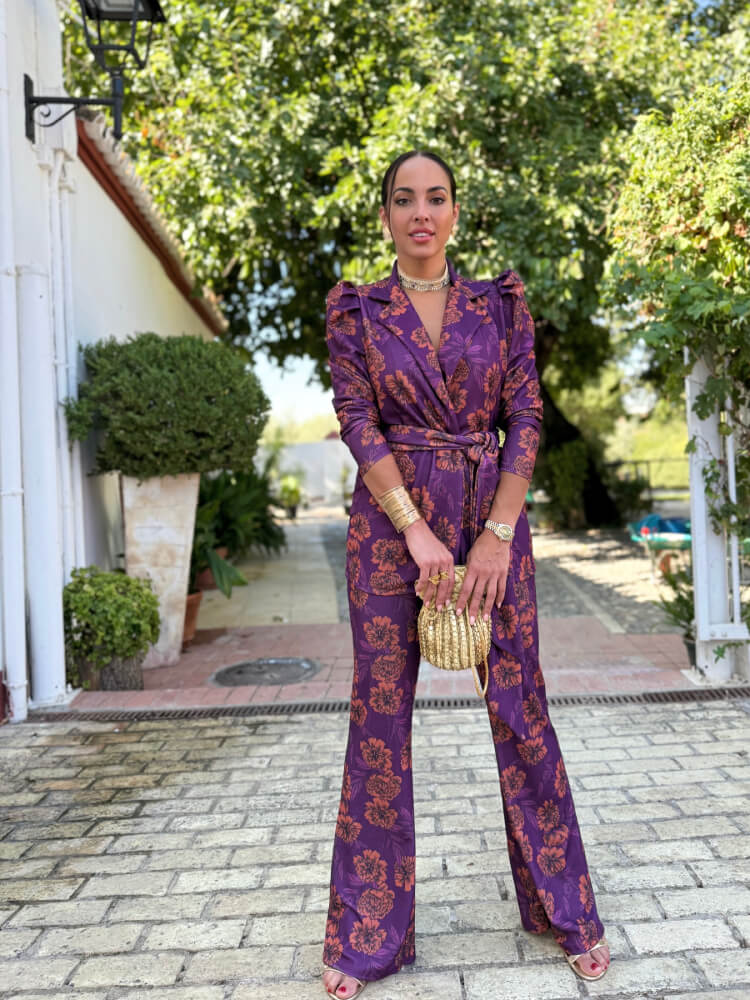 Conjunto de blazer y pantalón en tejido crespón elástico. La chaqueta incluye cinturón a modo de fajín atado.