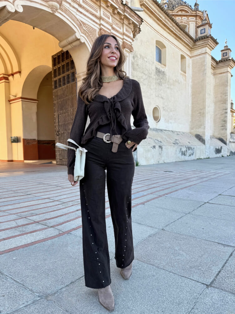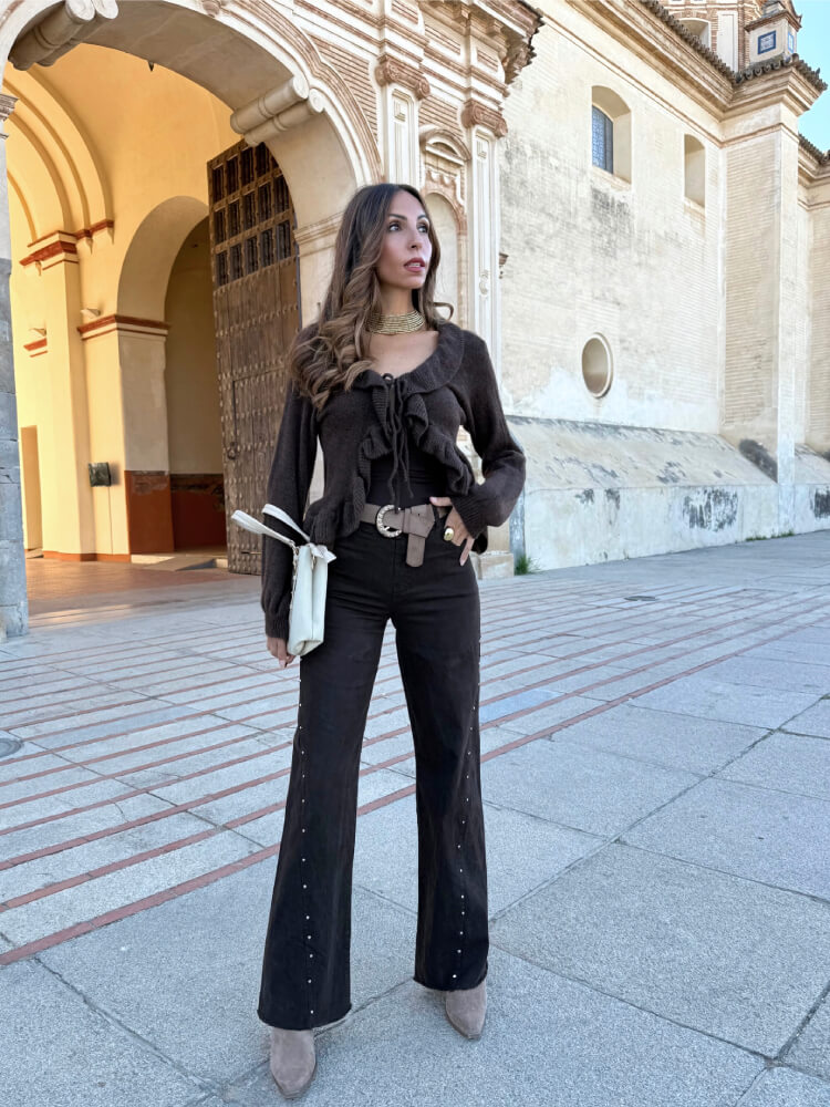 Pantalón vaquero en color marrón, cómodo por su tejido elástico que se adapta al cuerpo sin perder estructura, mientras que la pierna recta estiliza y alarga la silueta. Las tachas plateadas en los laterales aportan un toque brillante y moderno y el tiro medio lo hace versátil y favorecedor.