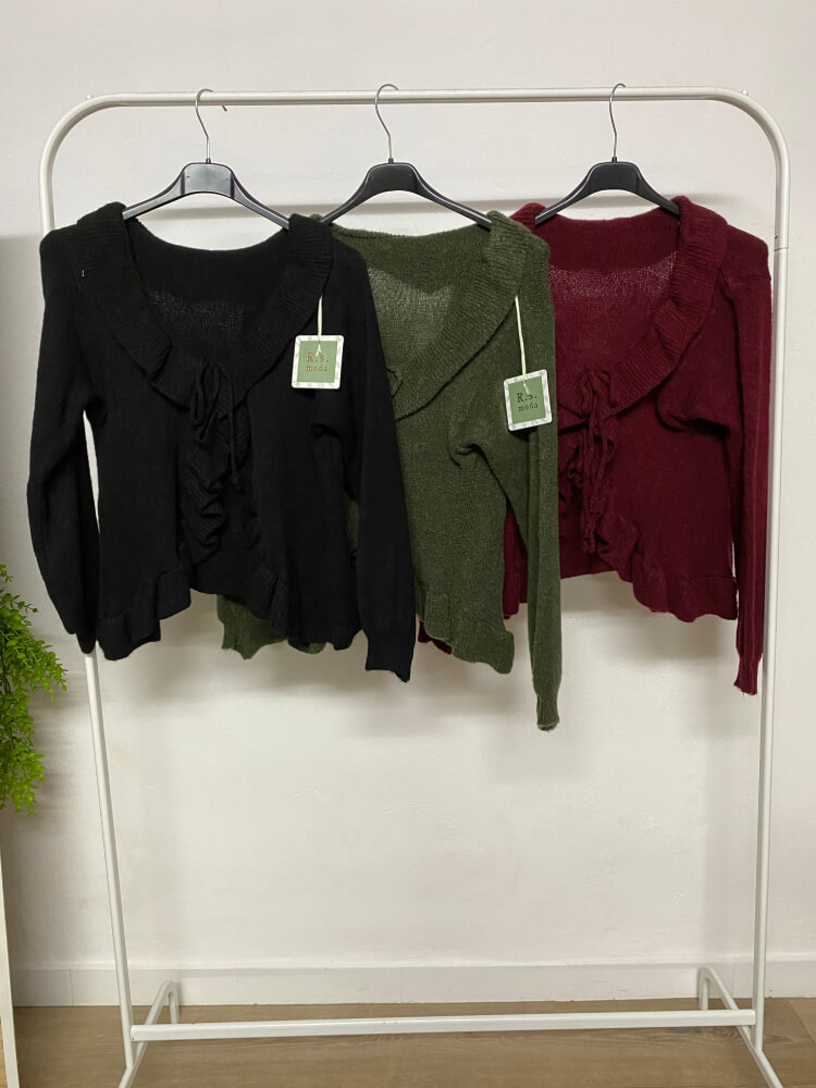 Rebeca anudada en la parte frontal con lazadas, con cuello de volante y manga ligeramente abullonada en la terminación del puño. El punto es muy gustoso y suave.