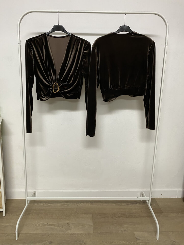 Top en terciopelo elástico con hombreras y detalle metálico dorado. Su diseño elegante es perfecto para cualquier ocasión especial.