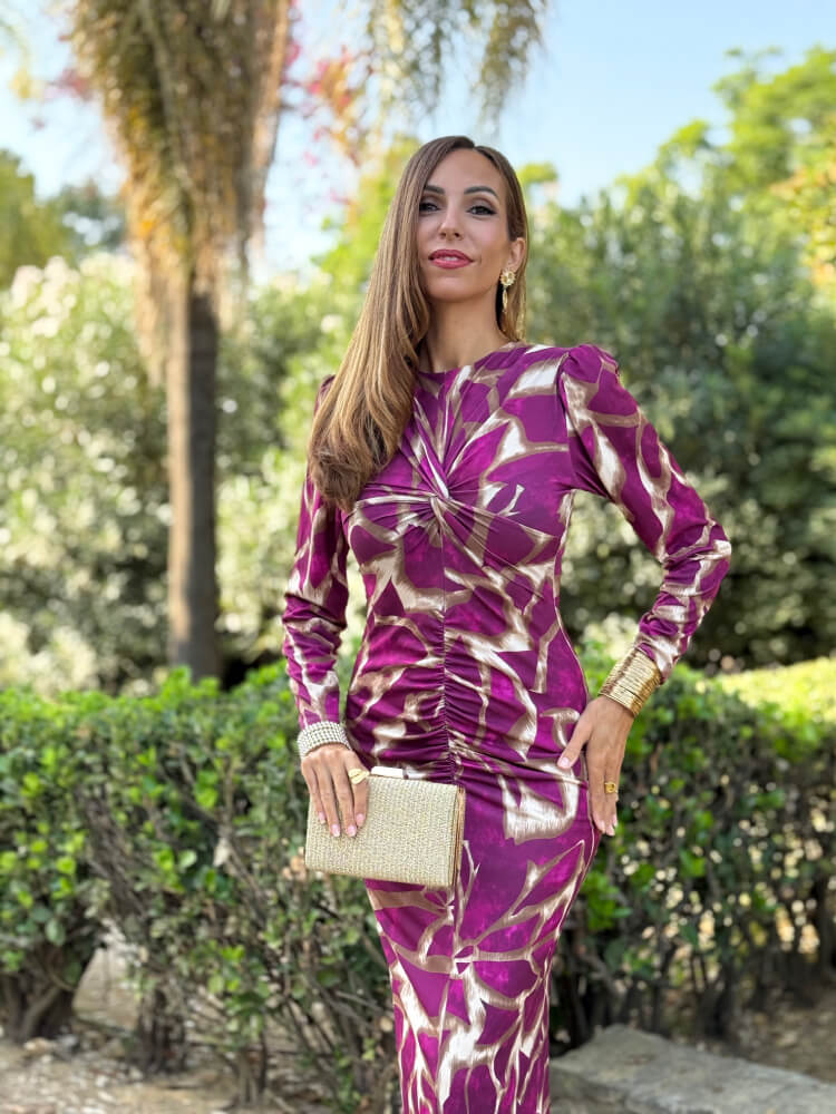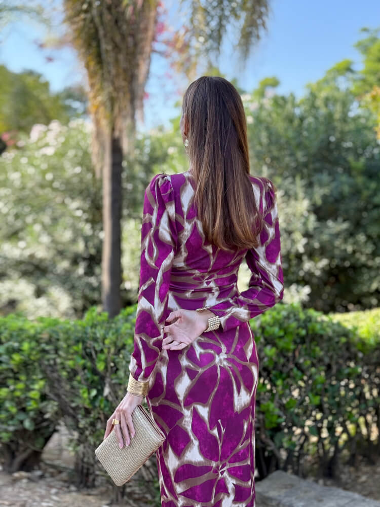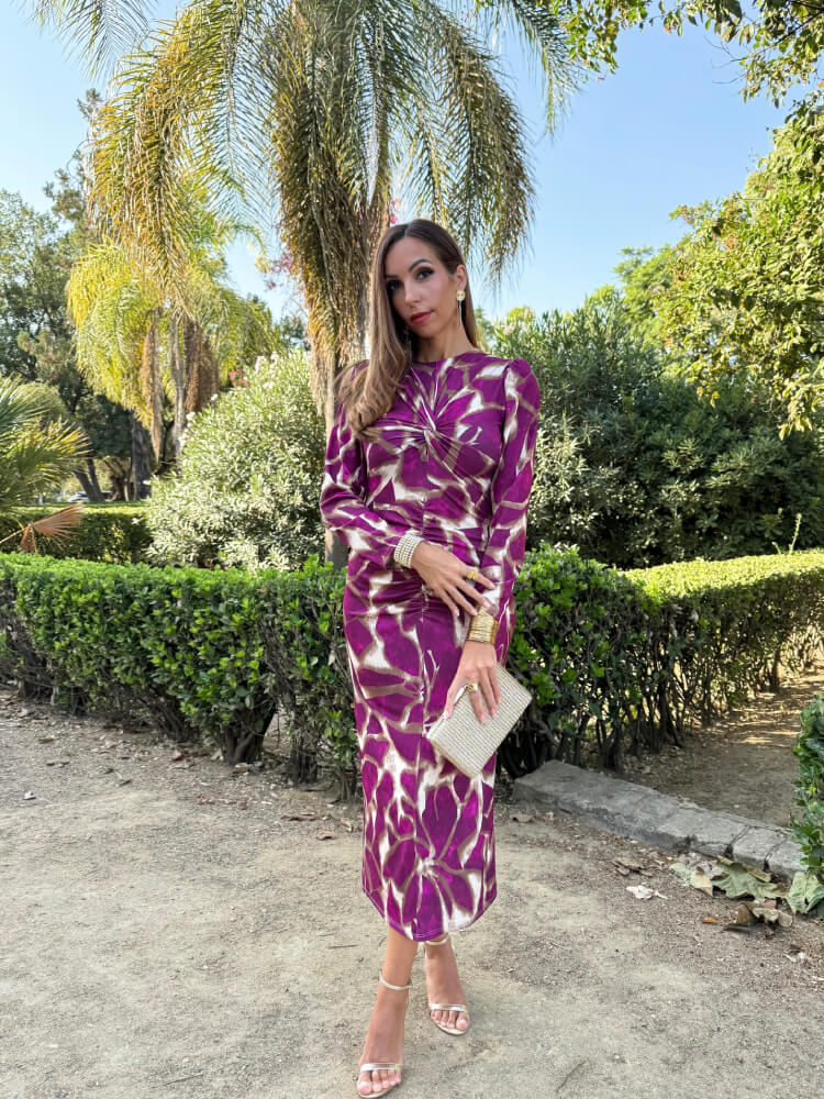 Vestido en tejido licra fría, sin brillo, con diseño de nudo en el pecho. Lleva hombreras y no tiene abertura en la falda. Estampado en tono buganvilla.