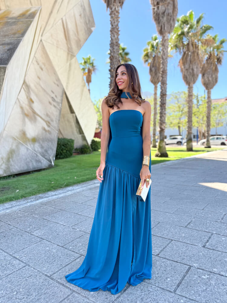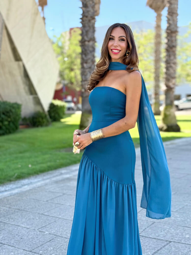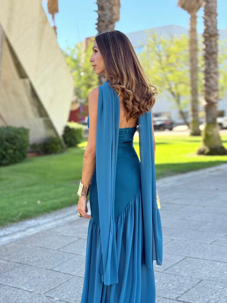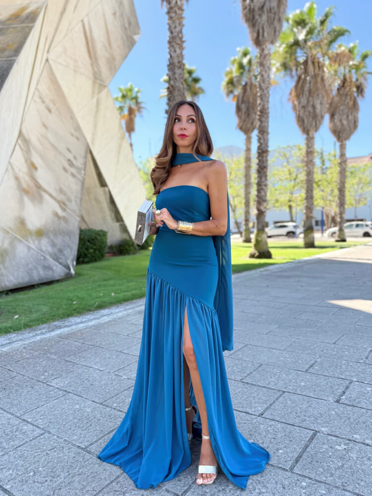 Vestido azul petróleo largo en crepe elástico y gasa, con cascos en el pecho y cierre de cremallera trasera. Incluye chal a juego para un acabado sofisticado. Forma parte de los vestidos de fiesta más elegantes, ideal para eventos donde quieras destacar con estilo y distinción.