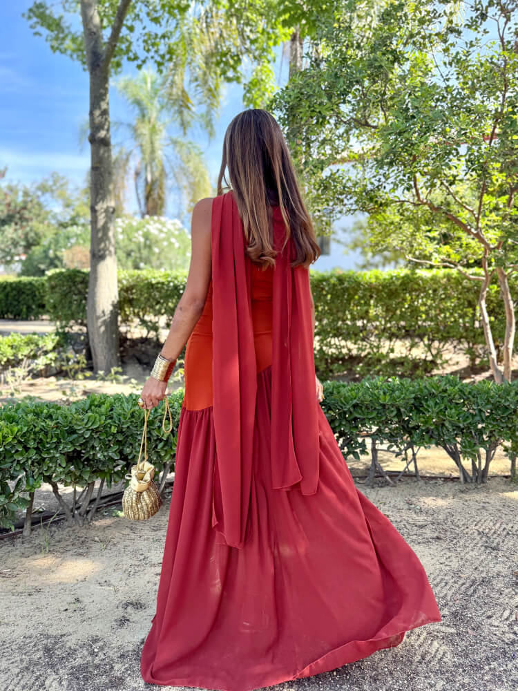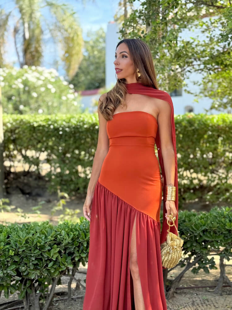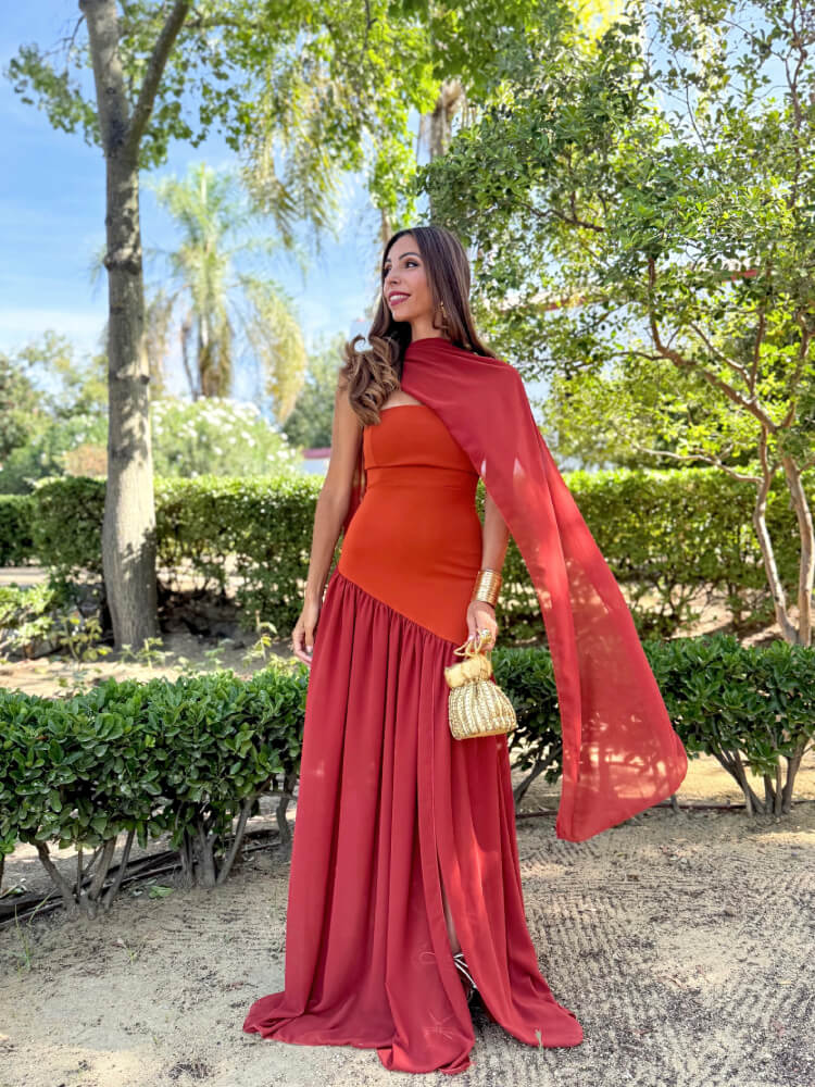 Vestido largo teja en crepe elástico y gasa con cascos en el pecho y cierre trasero con cremallera. Incluye chal a juego. Una prenda elegante y sofisticada ideal para celebraciones, aporta estilo y comodidad en cada ocasión especial con un diseño distinguido.