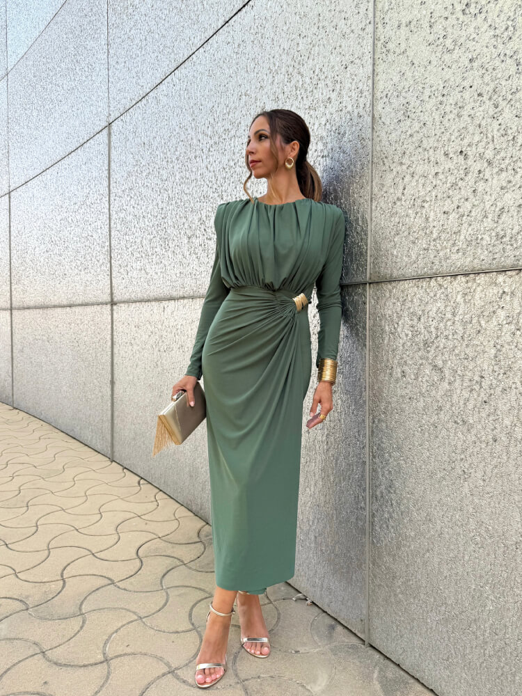 Vestido en tejido elástico sin brillo destaca por su drapeado estratégico que estiliza la figura y aporta movimiento. Las hombreras marcadas añaden estructura y fuerza al diseño, mientras que el broche lateral actúa como punto focal, elevando la silueta con sutileza.