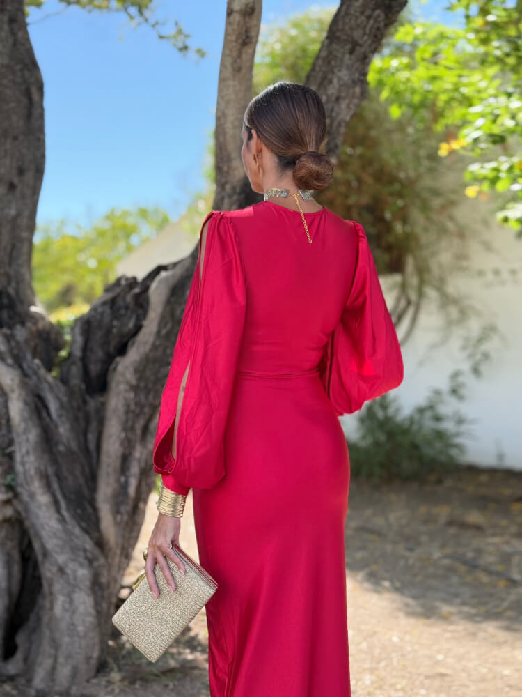 Vestido rojo en licra fría elástica con manga larga y aberturas que aportan distinción. El nudo lateral estiliza y la abertura en la pierna realza la figura. Ideal para eventos elegantes, ofrece comodidad y estilo en un diseño sofisticado y versátil.