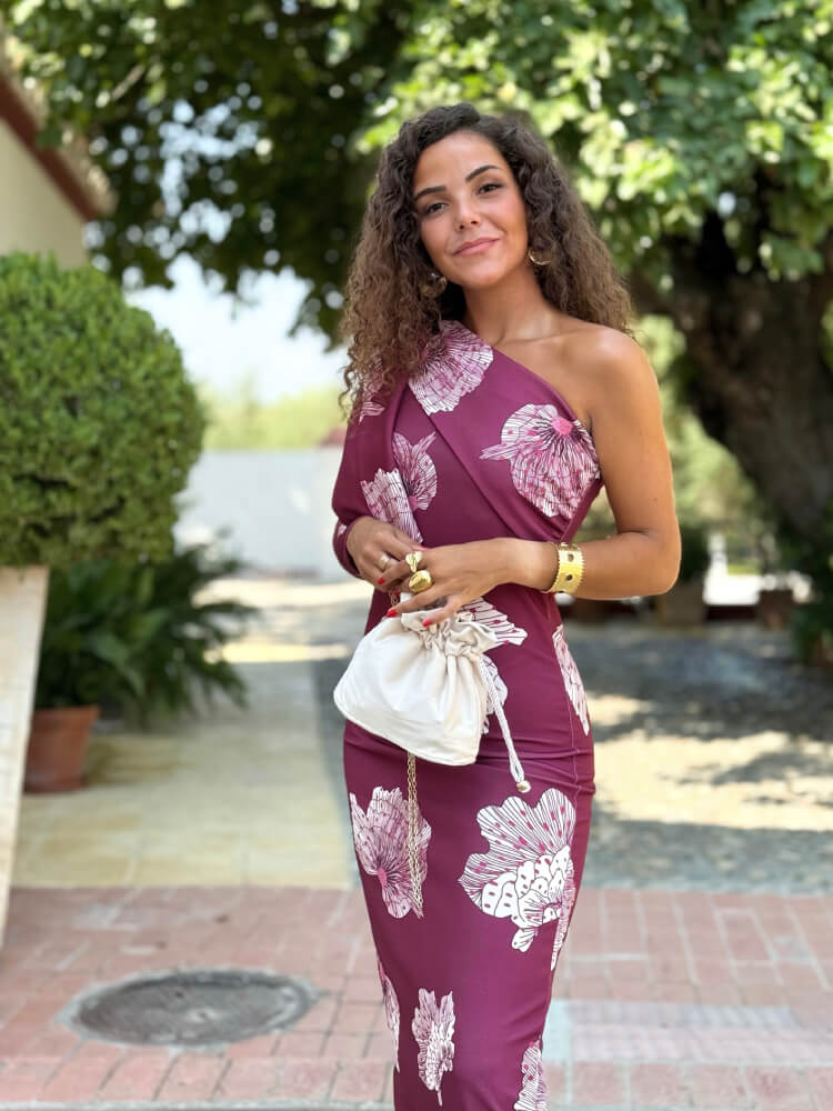 Vestido buganvilla con estampado blanco en crespón actual, manga con lazo en hombro y falda con abertura trasera. Una prenda sofisticada que realza la silueta y aporta comodidad. Ideal para eventos o celebraciones, combina frescura, estilo y distinción en cada ocasión.
