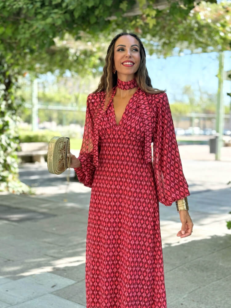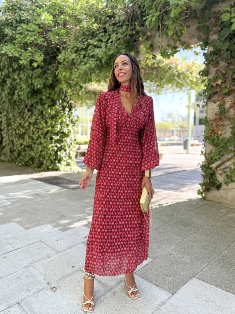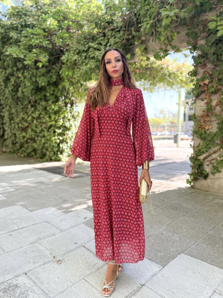 Vestido en tejido gasa con brillito, en tonos naranja y buganvilla, con estampado geométrico.