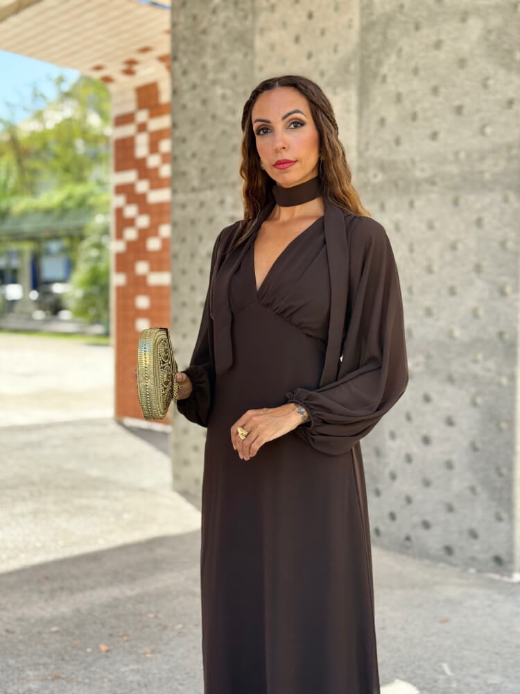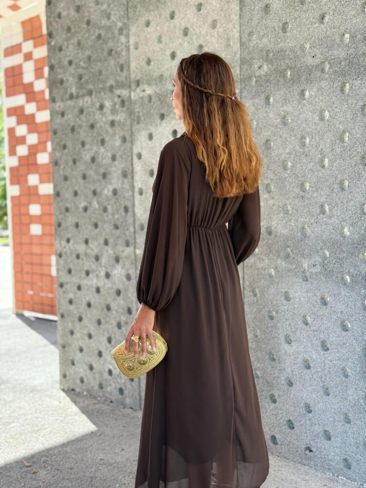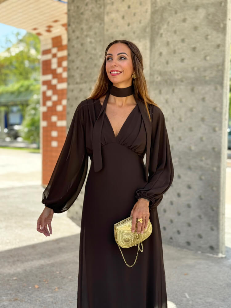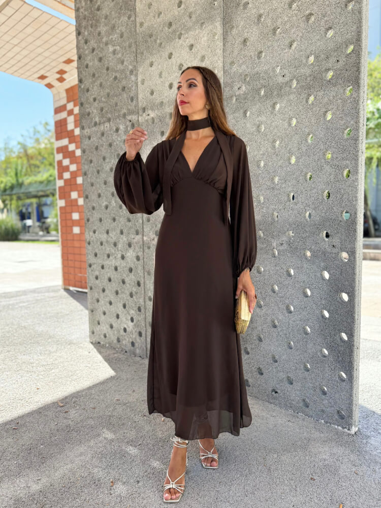 Vestido largo en gasa fluida con escote en V, mangas largas, goma elástica en la espalda y forro interior. Incluye mini chal para el cuello o la cintura. Elegancia cálida y sofisticada.