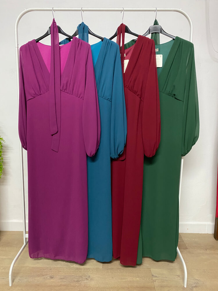 Vestido largo en gasa fluida con escote en V, mangas largas, goma elástica en la espalda y forro interior. Incluye mini chal para el cuello o la cintura.