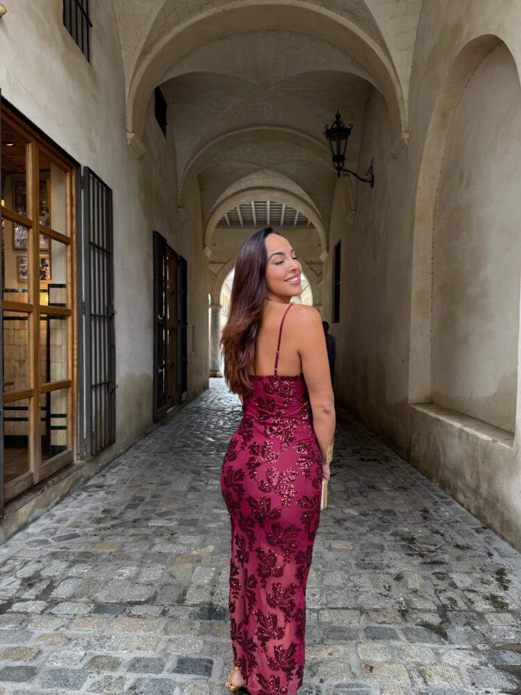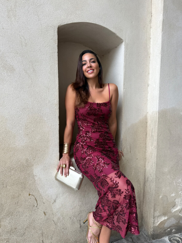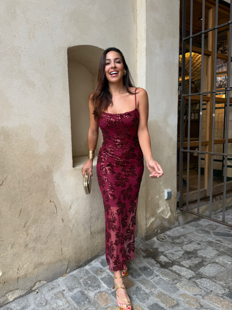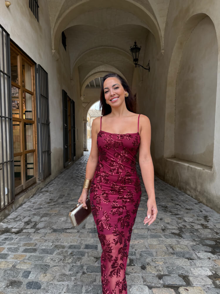 Vestido color vino de tirantas confeccionado en tul elástico con lentejuelas, que aporta brillo y textura a la silueta. Incluye una torera de manga larga en el mismo tejido, que se puede quitar y poner según el estilo deseado. El vestido lleva forro interior corto, dejando entrever las piernas con sutileza, y aberturas laterales que añaden movimiento y sensualidad. Una pieza pensada para eventos, invitadas o estilismos nocturnos con carácter.