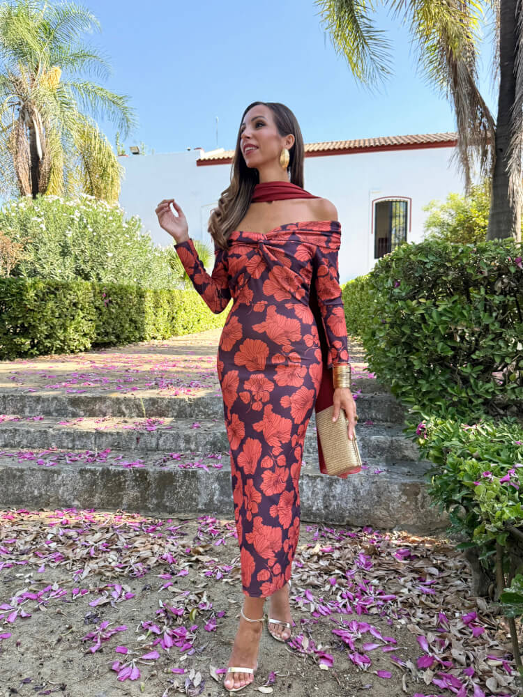 Vestido largo con diseño off-shoulder, escote en nudo y estampado floral. Mangas largas y corte fluido que aportan frescura y movimiento. Ideal para eventos con estilo.
