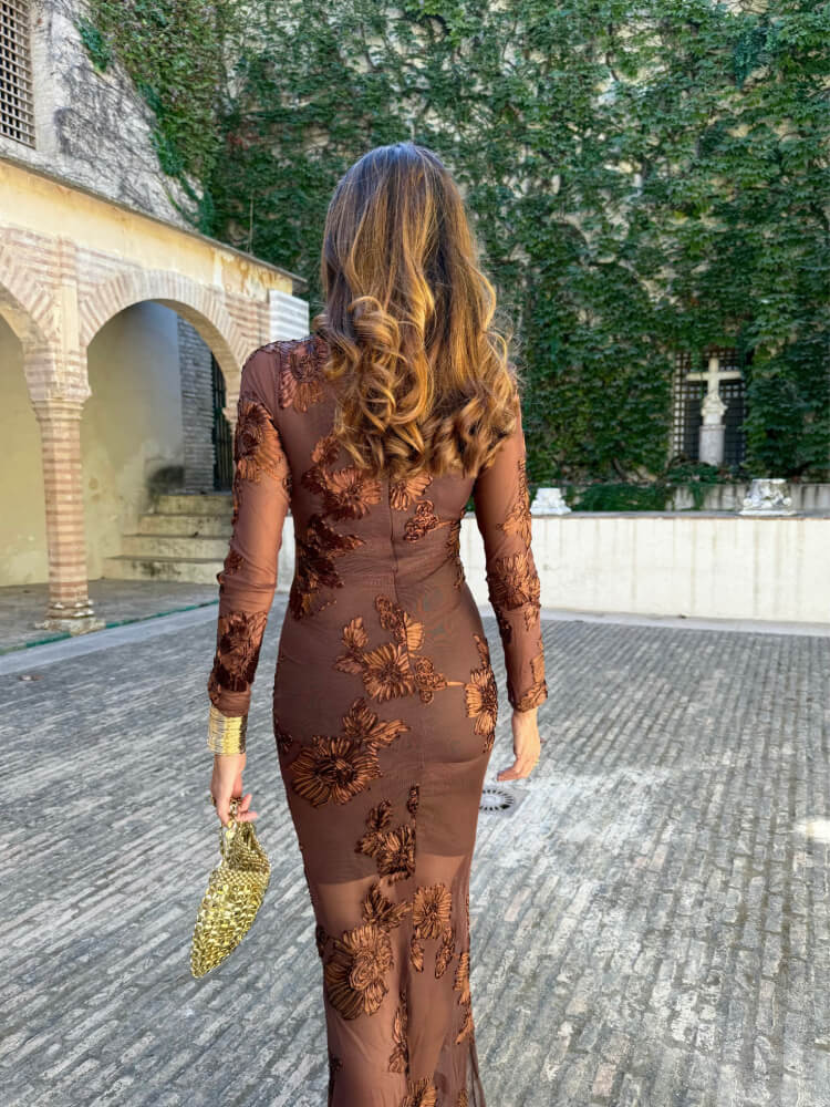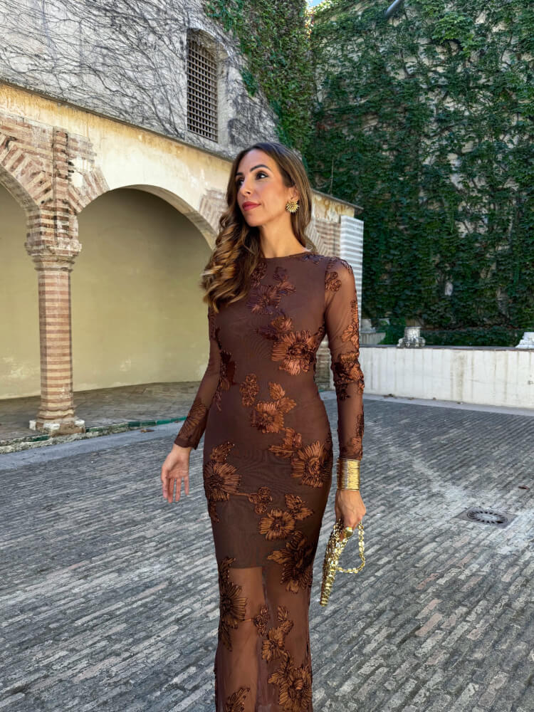 Vestido color marrón en tejido tul elástico con bordados de flores . Lleva forro interior por encima de la rodilla y cierra con cremallera trasera.