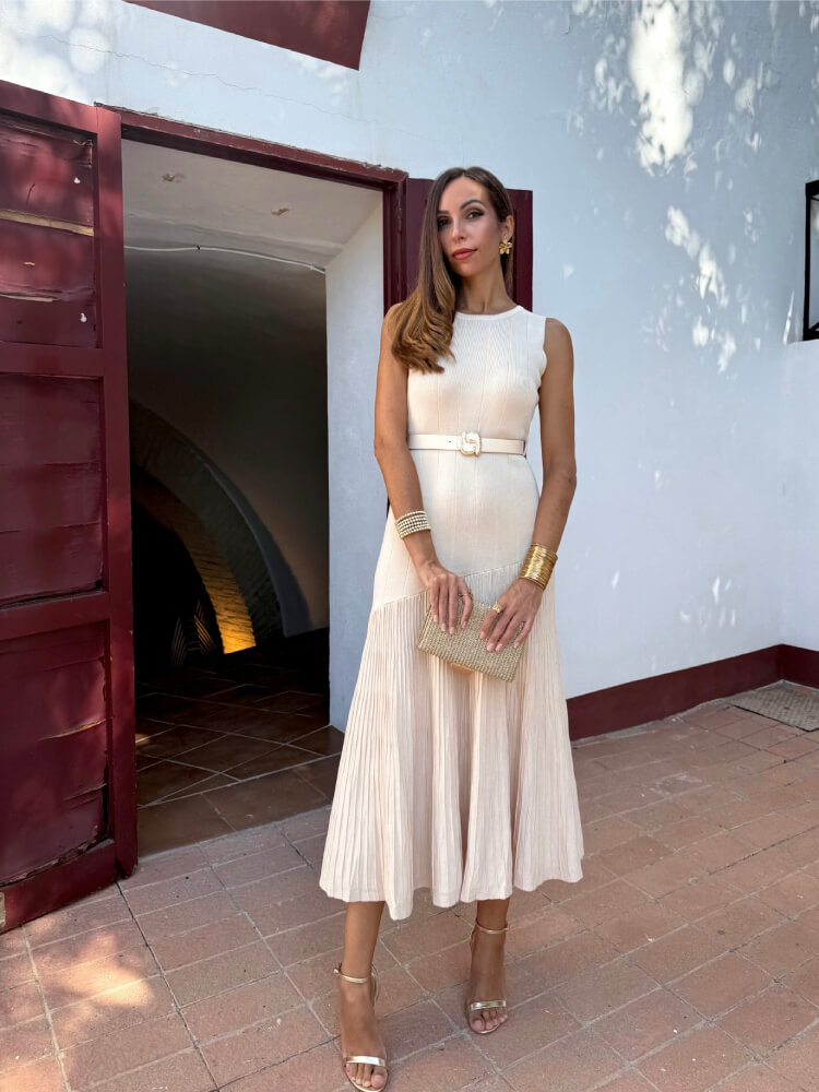 Vestido en punto suave y ligero, con cinturón a juego que define la cintura. Su corte midi y el movimiento de la falda aportan elegancia y fluidez. Ideal para looks de invitada relajados, eventos de día o estilismos neutros con encanto.