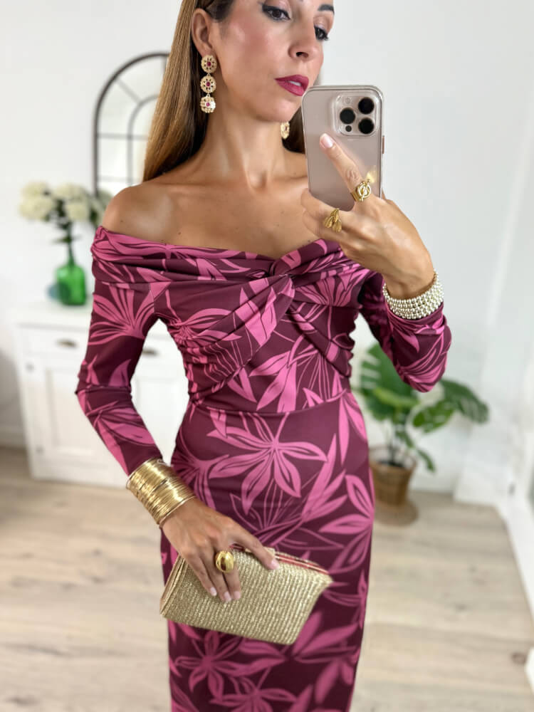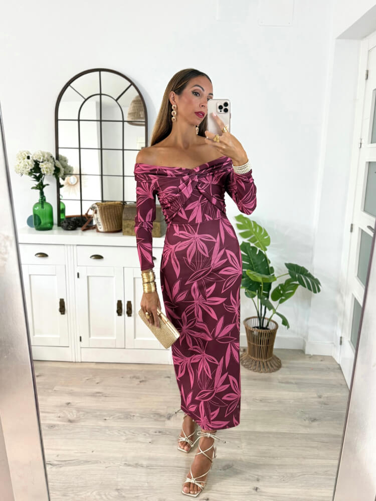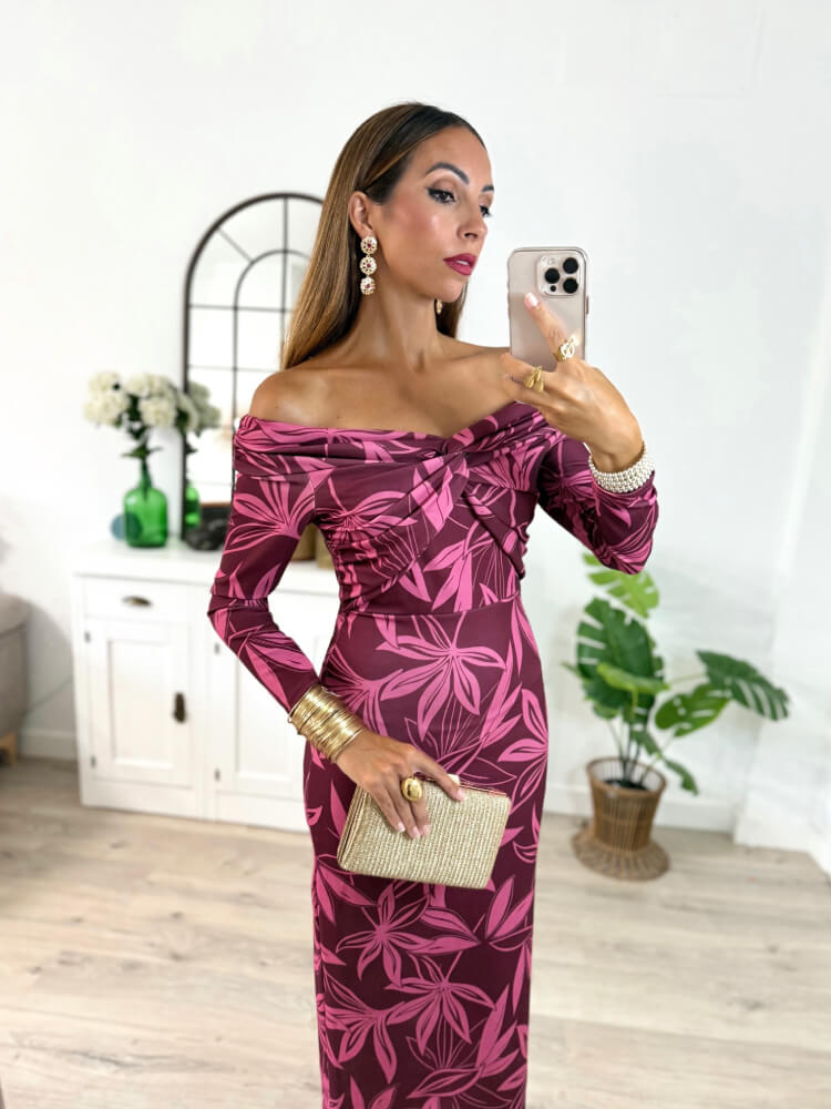 Vestido buganvilla largo con diseño off-shoulder, escote en nudo y estampado floral. Mangas largas y corte fluido que aportan frescura y movimiento. Ideal para eventos con estilo.