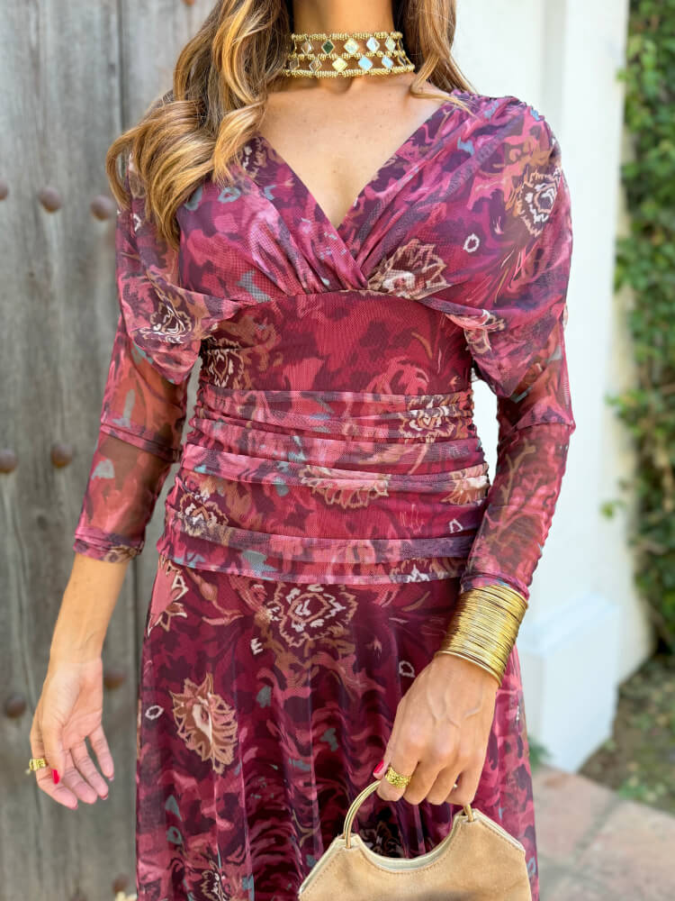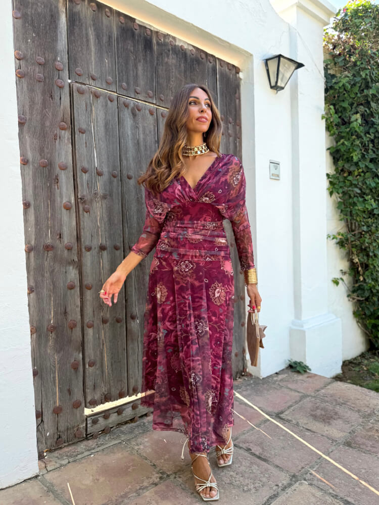 Vestido en tonos rojizos en tul elástico con forro interior. Manga drapeada, escote en V y falda con vuelo de corte midi. Femenino, fluido y favorecedor.