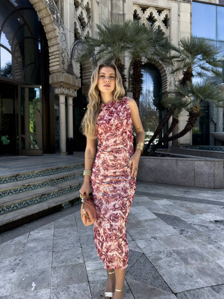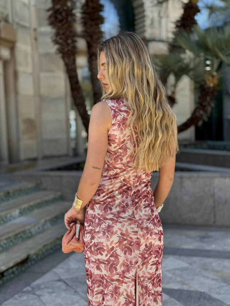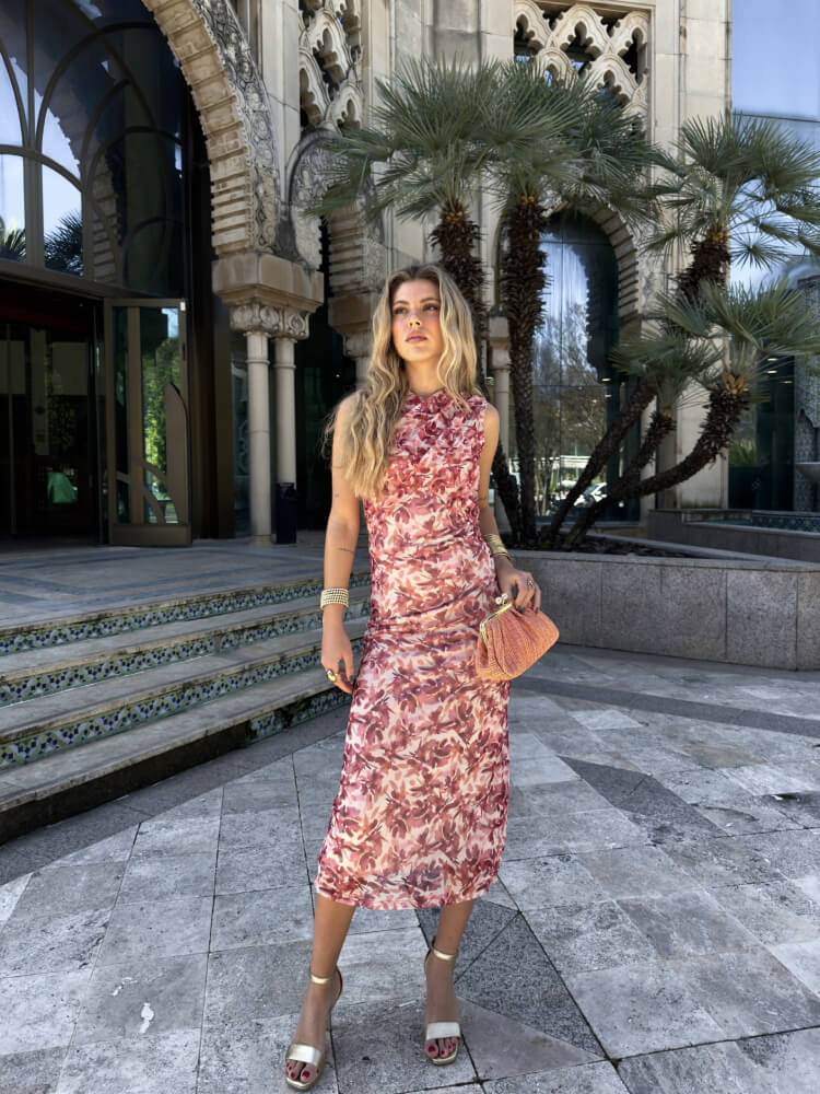 Vestido floral cruzado en gasa elástica. Lleva forro interior que asegura cobertura total y se adapta al cuerpo con suavidad.