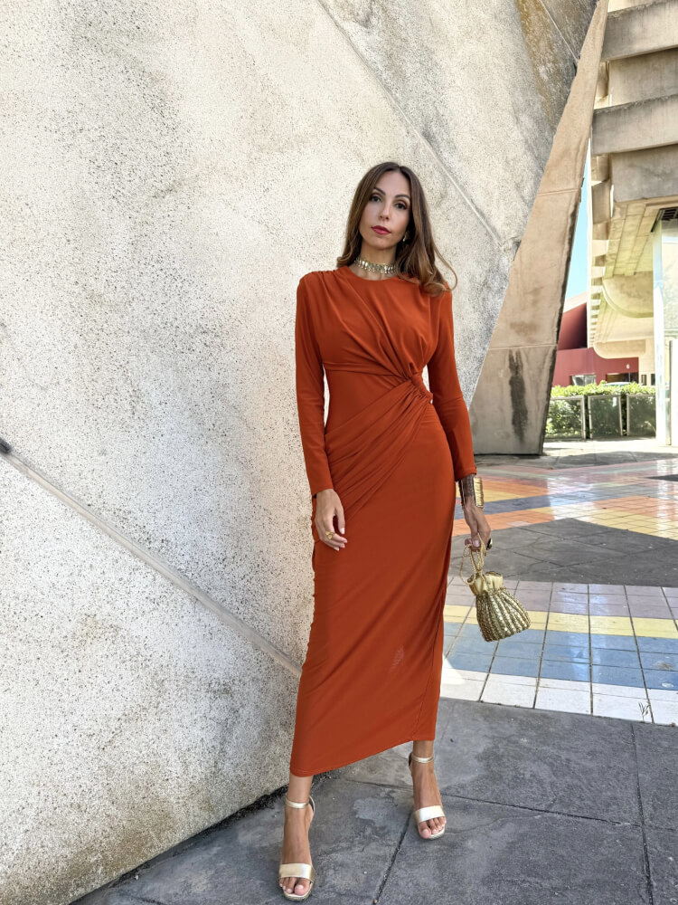 Vestido en tejido elástico, lleva frunce drapeado en la parte lateral de la cintura y hombreras.