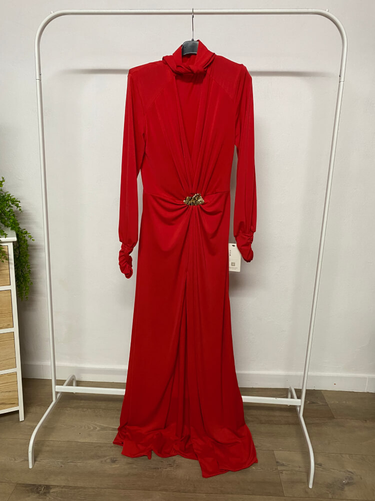 Vestido en tejido licra fría elástico, en manga larga con abertura en la parte frontal de la falda y broche en la cintura en metal dorado.