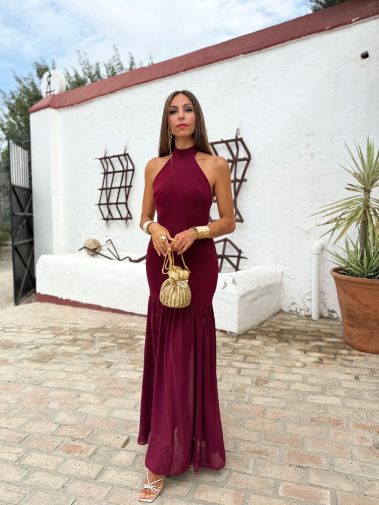 Vestido burdeos en crespón y gasa con cuello halter. Su falda fluida aporta movimiento y frescura, creando un estilo elegante y especial. Ideal para eventos, resalta tu presencia con comodidad y un diseño actual que transmite distinción y sofisticación.