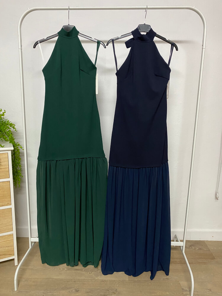 Vestido combinado en tejido crespón y tejido gasa. El cuello halter le da un toque elegante y especial.