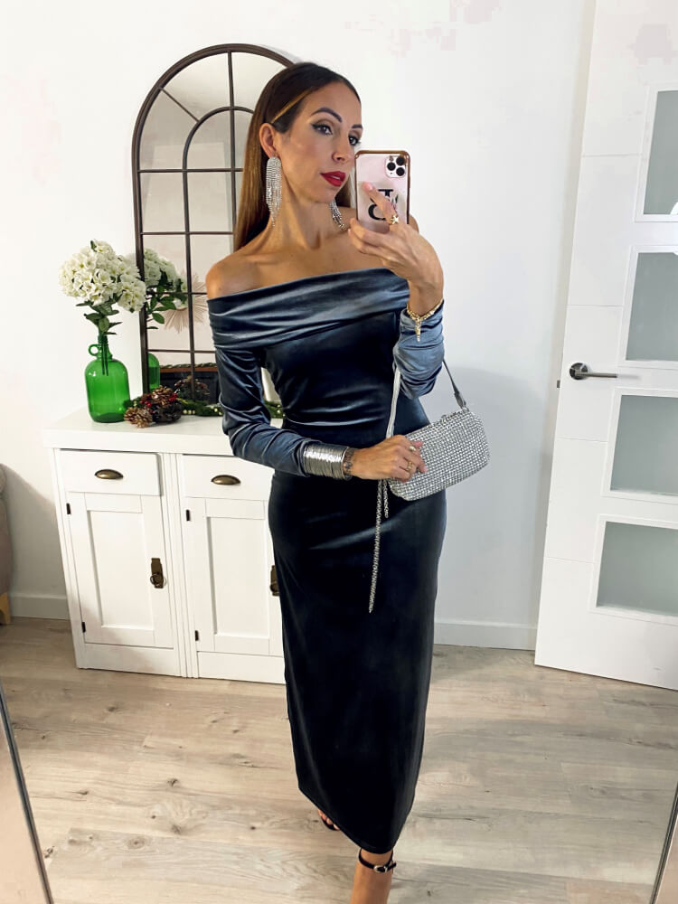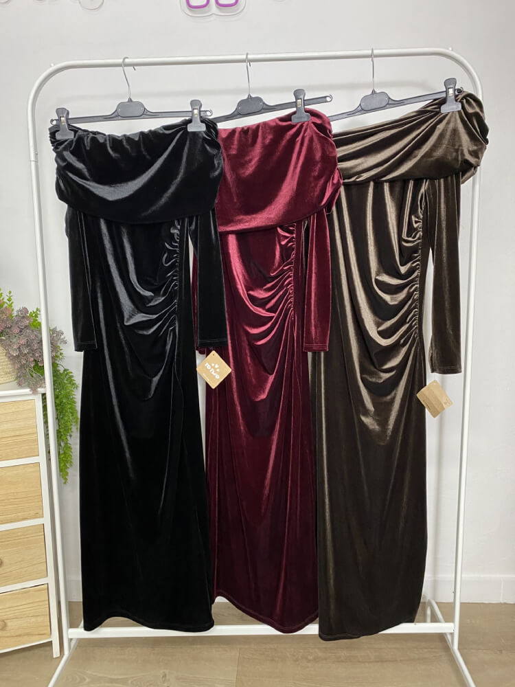 Vestido largo confeccionado en terciopelo elástico, con tacto suave y brillo sutil. El diseño incluye drapeado en la cintura que estiliza la figura y una abertura en la parte trasera de la falda que aporta movimiento y sensualidad. Una pieza pensada para eventos, invitadas o estilismos nocturnos con presencia. Combina comodidad, textura y elegancia en un solo gesto.