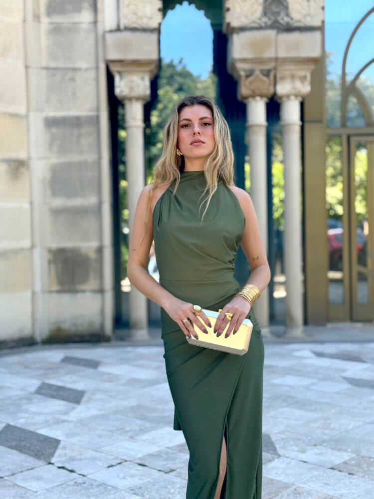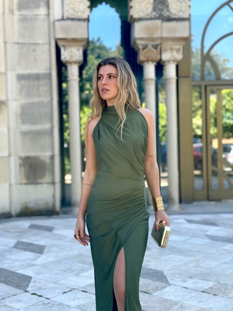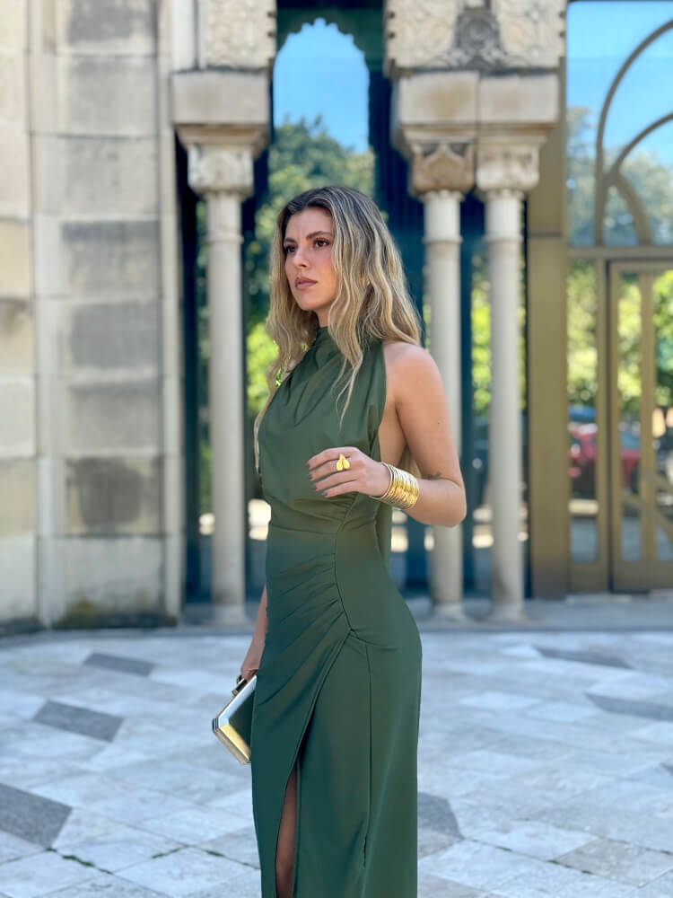 Vestido verde, en tejido satinado elástico, atado al cuello con espalda descubierta y abertura en el lateral de la pierna.
