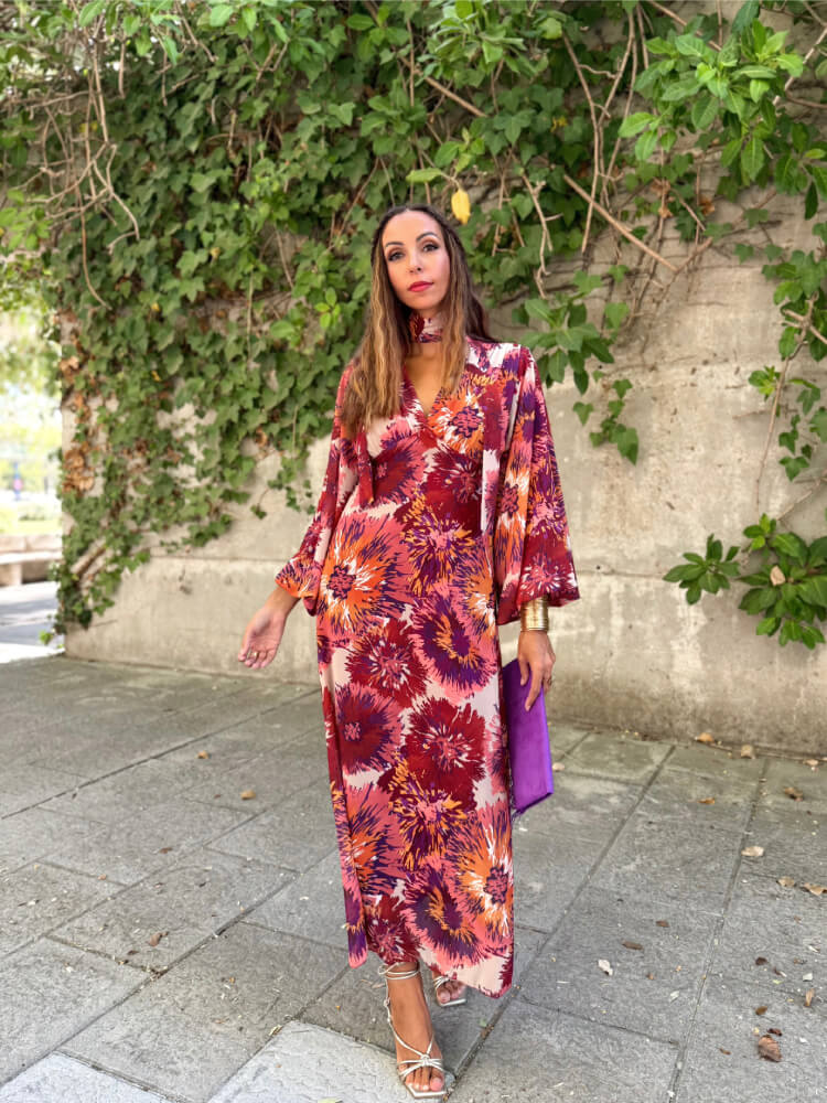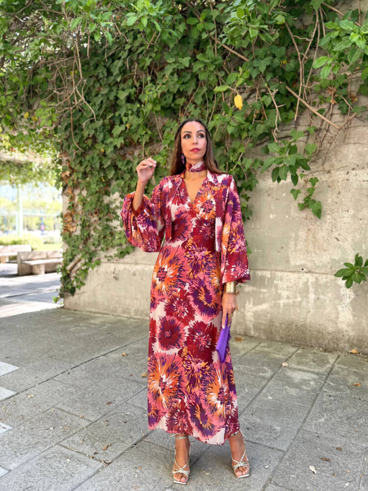 Vestido en tejido gasa con brillito, en tonos naranja y burdeos, con estampado floral.