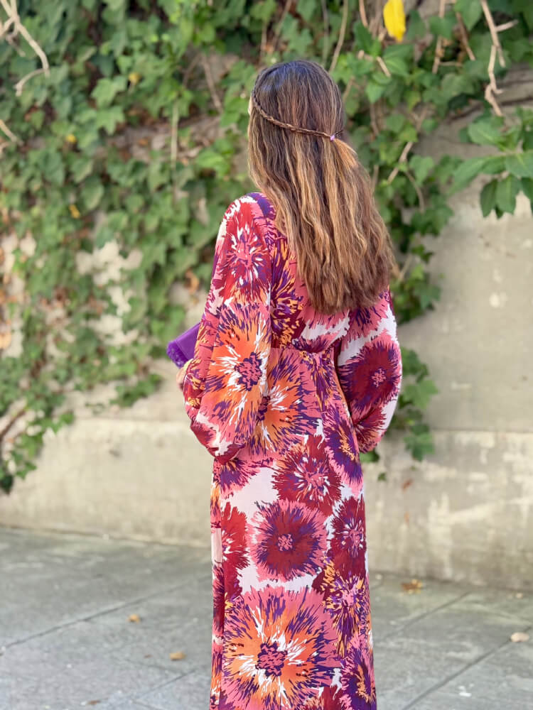 Vestido de gasa naranja burdeos con estampado floral. Incluye mini chal para cuello o cintura, goma trasera y forro interior. Su diseño fresco y elegante realza tu estilo en eventos, aportando comodidad y versatilidad en cada ocasión especial.