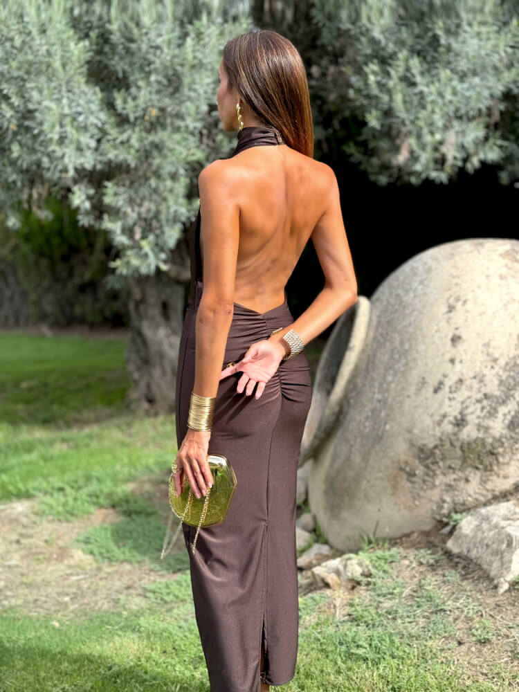 Vestido en tejido licra de color marrón chocolate con brillo y cuello halter. Espalda descubierta.